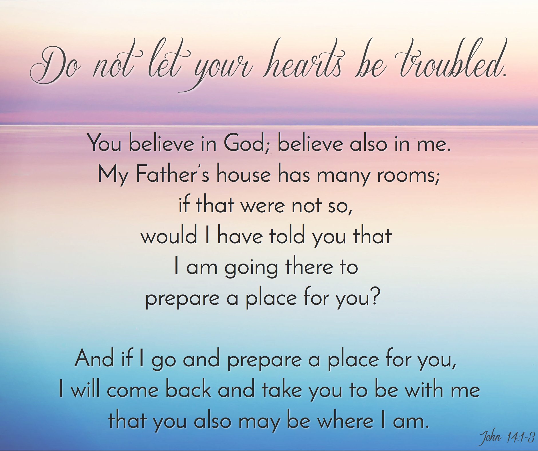 John 14 1 3 Do Not Let Your Hearts Be Troubled You Believe In God Believe Also In Me My Father S House Has Many Rooms If That Were Not So Would I Have Told